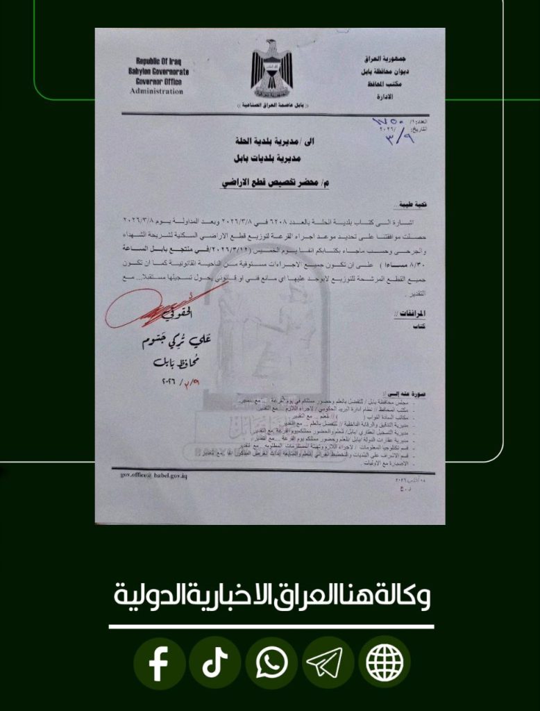 محافظة بابل تحدد الخميس موعداً لقرعة توزيع أراضي الشهداء والجرحى