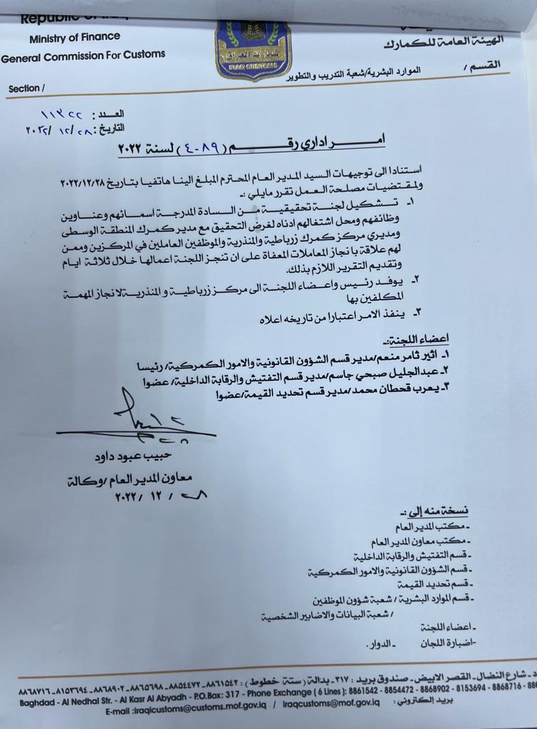 مدير عام الهيئة العامة للكمارك يوعز بتشكيل لجنة تحقيقية