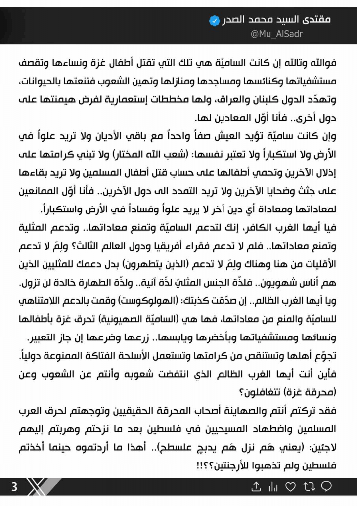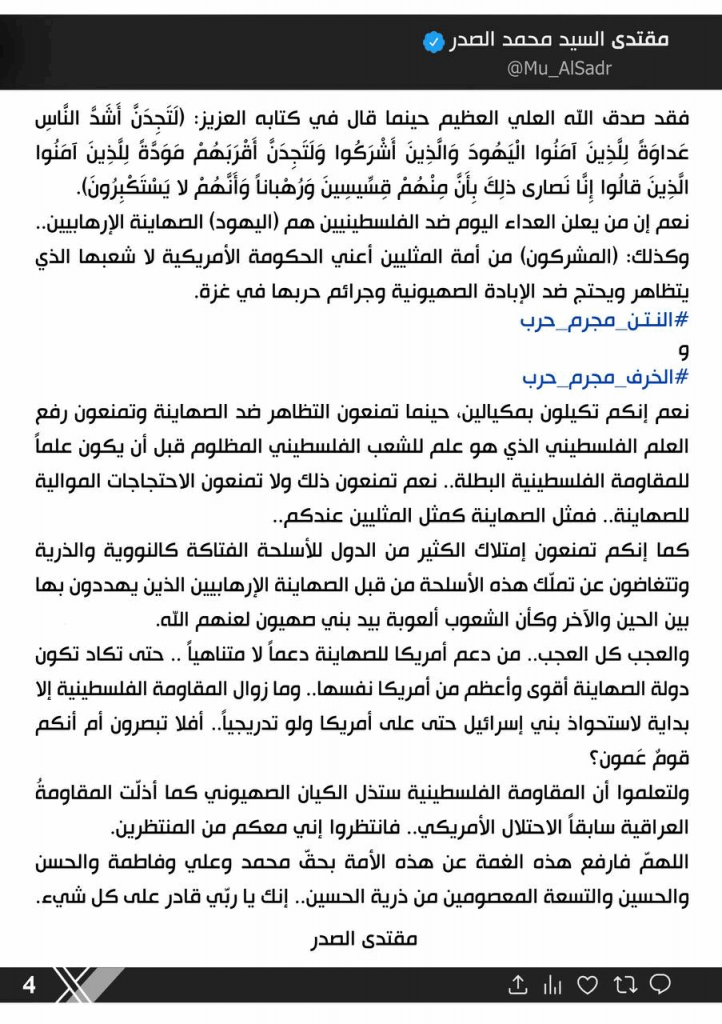 مستشهدا ما حصل بالعراق.. الصدر: المقاومة الفلسطينية ستذل الكيان الصهيوني