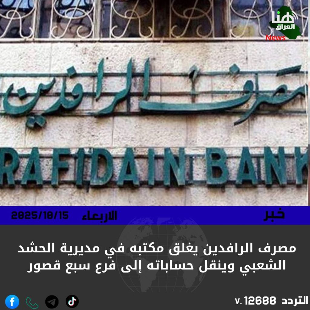 أغلق مصرف الرافدين مكتبه في مديرية الحشد الشعبي وقرر نقل حساباته المالية إلى فرع سبع قصور في العاصمة بغداد، بعد موافقة البنك المركزي العراقي.
