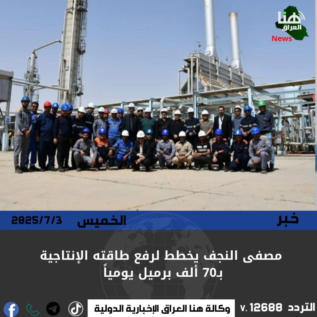 أعلنت إدارة مصفى النجف الأشرف عن خطة تطويرية لرفع الطاقة الإنتاجية بإضافة 70 ألف برميل يومياً، بهدف تغطية الحاجة المحلية وتصدير الفائض من المشتقات النفطية، ما ينعكس إيجاباً على الإيرادات.