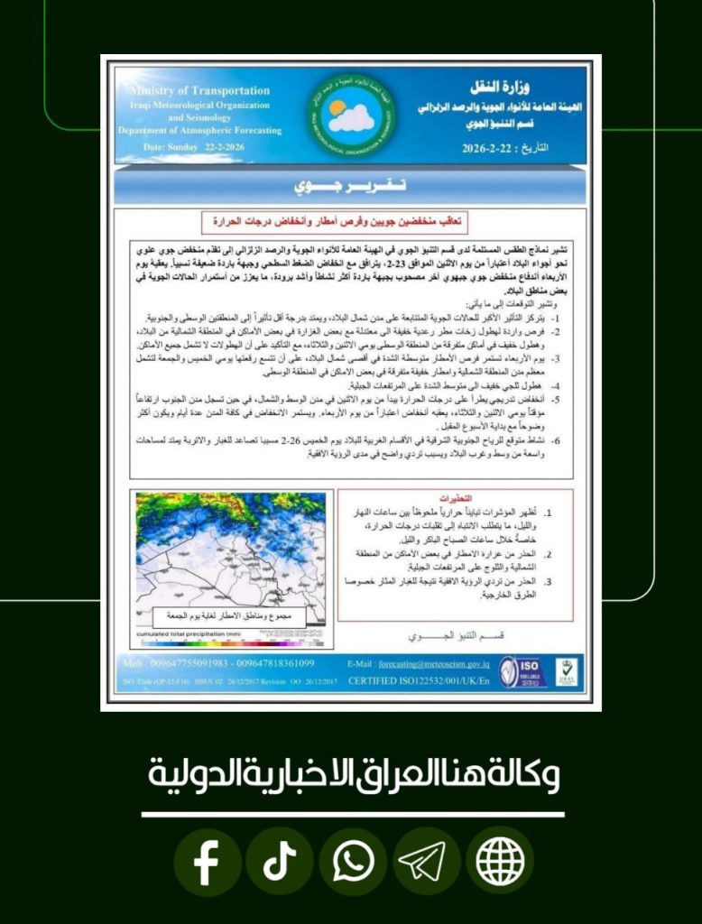 الرئيسية/الطقس/منخفضات جوية متتابعة تضرب البلاد: أمطار وثلوج وانخفاض ملموس في درجات الحرارة الطقسمحلي منخفضات جوية متتابعة تضرب البلاد: أمطار وثلوج وانخفاض ملموس في درجات الحرارة شاركها فيسبوك X لينكدإن Tumblr بينتيريست Reddit VKontakte Odnoklassniki Pocket مشاركة عبر البريد طباعة