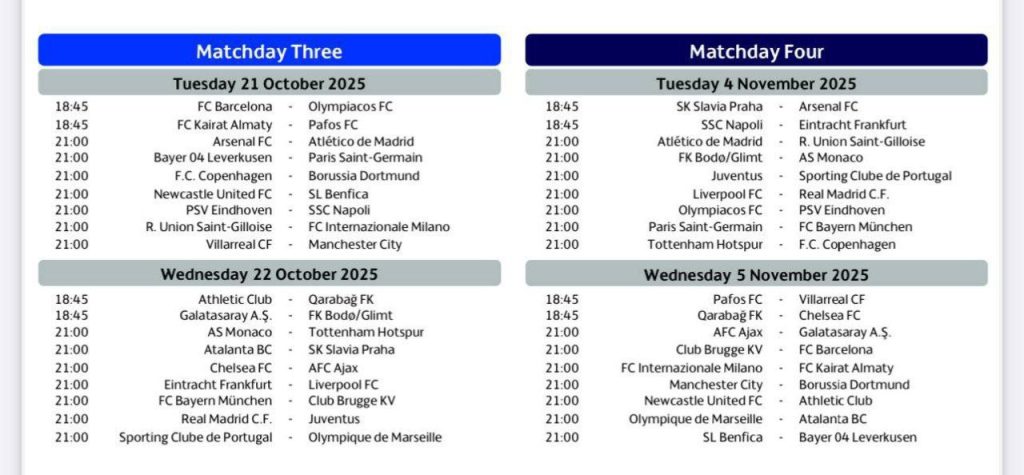مواعيد الجولة الثالثة والرابعة في دوري أبطال أوروبا