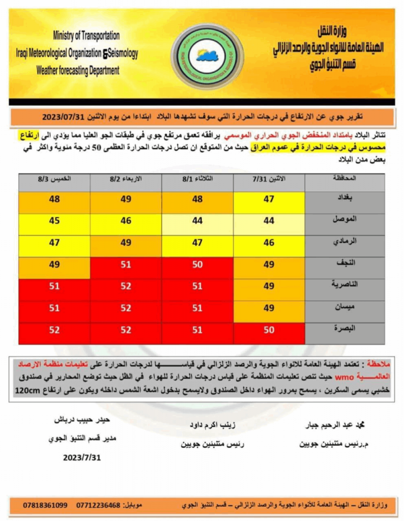 نشرت هيئة الانواء الجوية جدولا بدرجات الحرارة المتوقعة للأيام المقبلة من شهر آب في عدد من محافظات العراق ، حيث تجاوزت درجة الحرارة 50 درجة مئوية في عدد من محافظات البلاد .