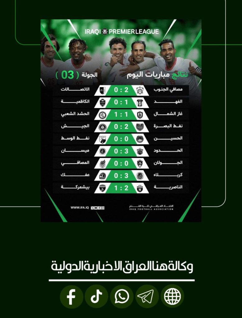 نتائج مباريات الأحد ضمن الجولة الثالثة من الدوري العراقي الممتاز