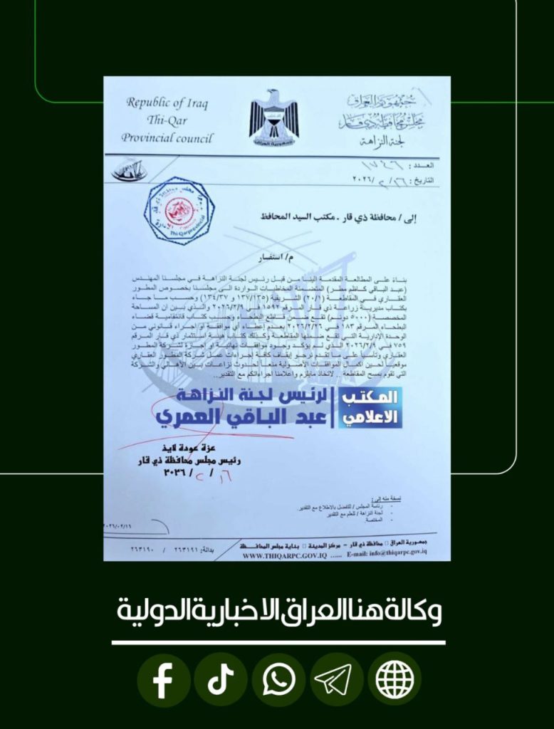 نزاهة ذي قار تقرر الإيقاف الفوري لإجراءات “المطور العقاري” حماية لحقوق المواطنين ومنعا للتجاوز على المال العام لحين اكتمال الموافقات القانونية