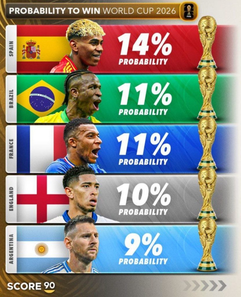 الرئيسية/رياضة/نسبة كل مُنتخب للفوز بكأس العالم 2026 حسب الاحصائيات الرياضية رياضة نسبة كل مُنتخب للفوز بكأس العالم 2026 حسب الاحصائيات الرياضية شاركها فيسبوك X لينكدإن Tumblr بينتيريست Reddit VKontakte Odnoklassniki Pocket مشاركة عبر البريد طباعة