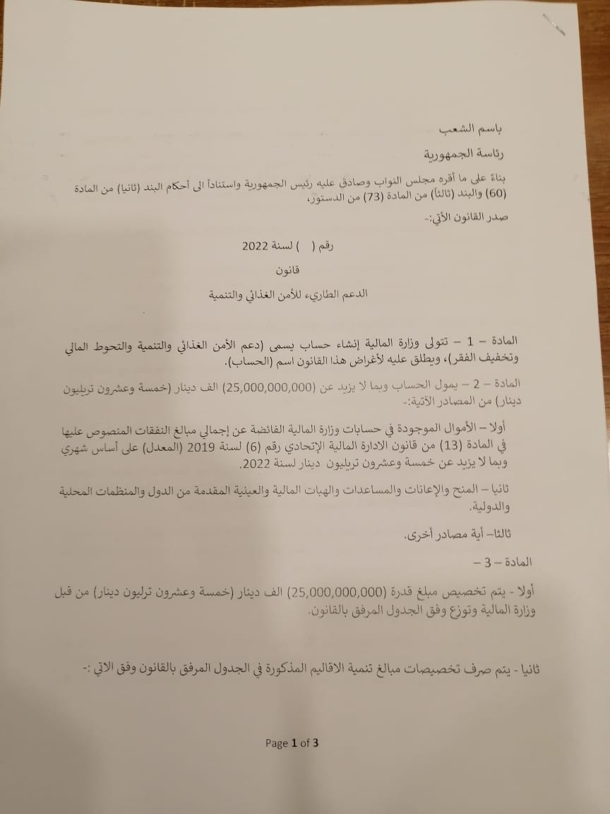 اليوم الثلاثاء، نص مقترح قانون الأمن الغذائي والتنمية المعد الى القراءة الثانية.