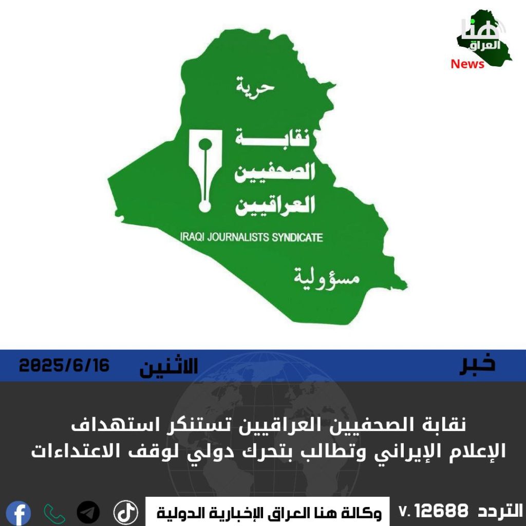 أعربت نقابة الصحفيين العراقيين عن استنكارها الشديد للعدوان الصهيوني الغاشم الذي استهدف مبنى هيئة الإذاعة والتلفزيون الإيرانية في العاصمة طهران، والذي أسفر عن سقوط عدد من الموظفين العاملين في الهيئة، وأدى إلى انقطاع البث في القناة الإخبارية الرسمية الإيرانية.