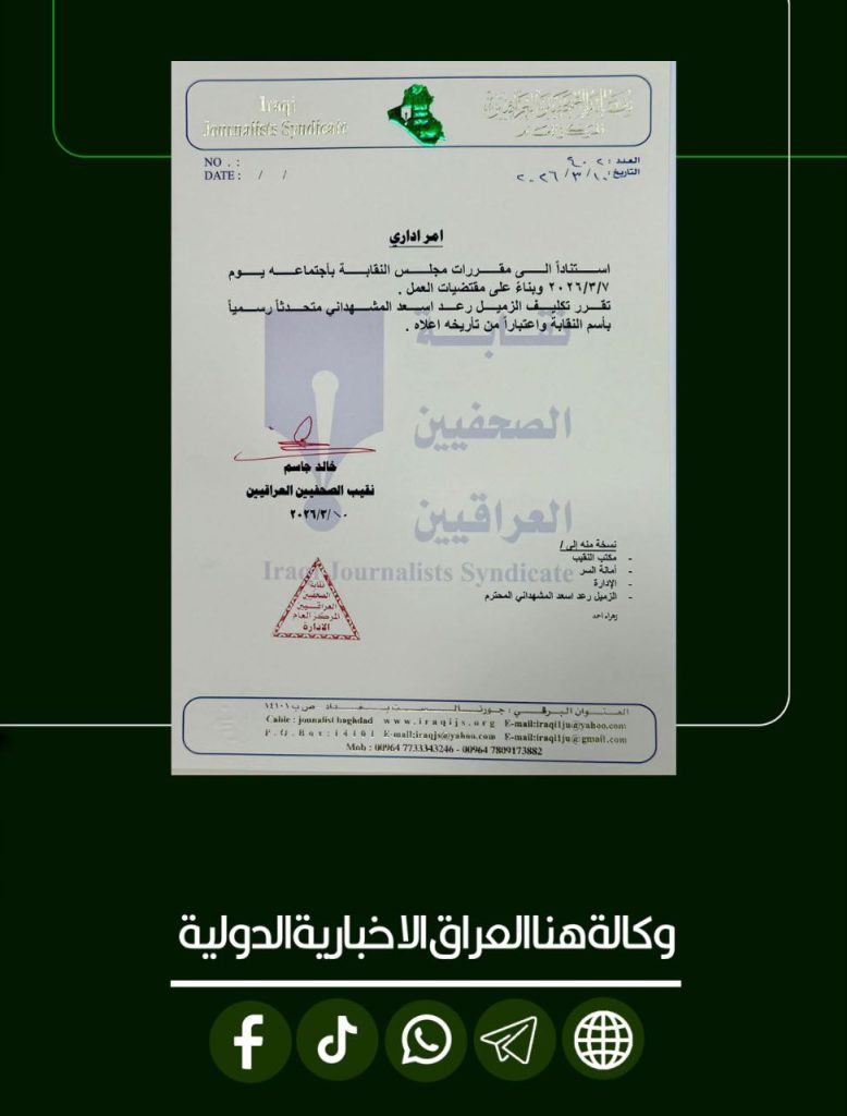 نقابة الصحفيين العراقيين تقرر تكليف الزميل رعد أسعد المشهداني متحدثاً رسمياً لها .
