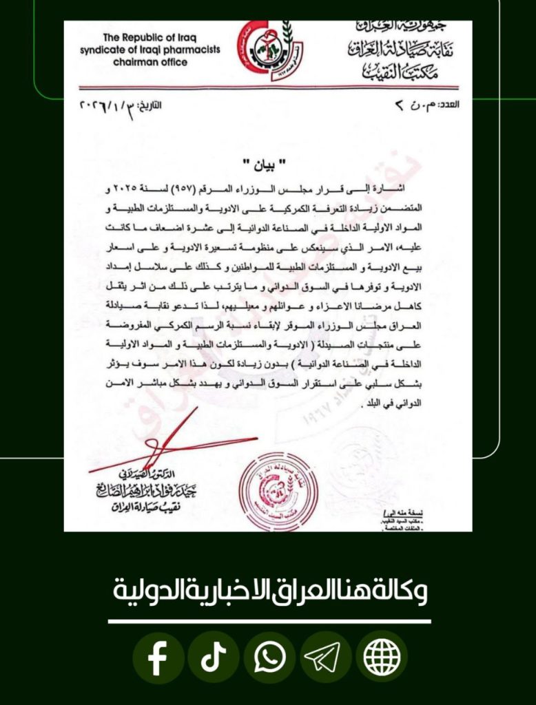 الرئيسية/صحة/نقابة صيادلة العراق تطالب بعدم زيادة التعرفة الجمركية على الأدوية والمستلزمات والمواد الاولية الداخلة في الصناعة الدوائية صحةمحلي نقابة صيادلة العراق تطالب بعدم زيادة التعرفة الجمركية على الأدوية والمستلزمات والمواد الاولية الداخلة في الصناعة الدوائية شاركها فيسبوك X لينكدإن Tumblr بينتيريست Reddit VKontakte Odnoklassniki Pocket مشاركة عبر البريد طباعة