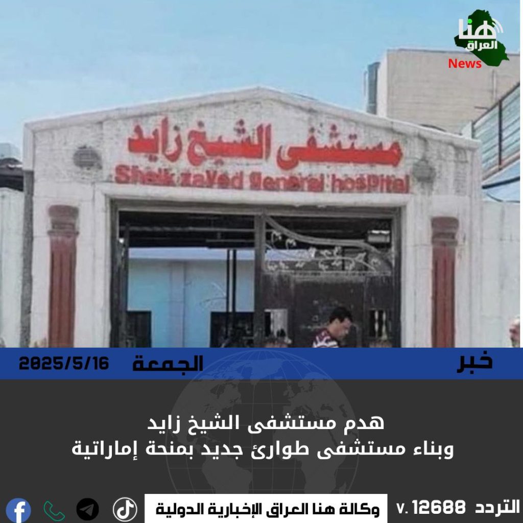 أعلن رئيس لجنة الصحة والبيئة النيابية، اليوم الجمعة، أنه سيتم هدم مستشفى الشيخ زايد في العاصمة بغداد، وإقامة مستشفى طوارئ حديث على أرضه، وذلك بتمويل منحة مقدمة من دولة الإمارات.