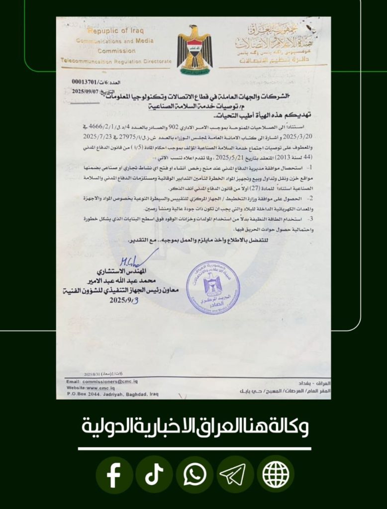 الرئيسية/سياسة/هيأة الإعلام والاتصالات تصدر توجيهات ملزمة لتعزيز متطلبات السلامة الصناعية في قطاع الاتصالات وتكنولوجيا المعلومات سياسةمحلي هيأة الإعلام والاتصالات تصدر توجيهات ملزمة لتعزيز متطلبات السلامة الصناعية في قطاع الاتصالات وتكنولوجيا المعلومات شاركها فيسبوك X لينكدإن Tumblr بينتيريست Reddit VKontakte Odnoklassniki Pocket مشاركة عبر البريد طباعة