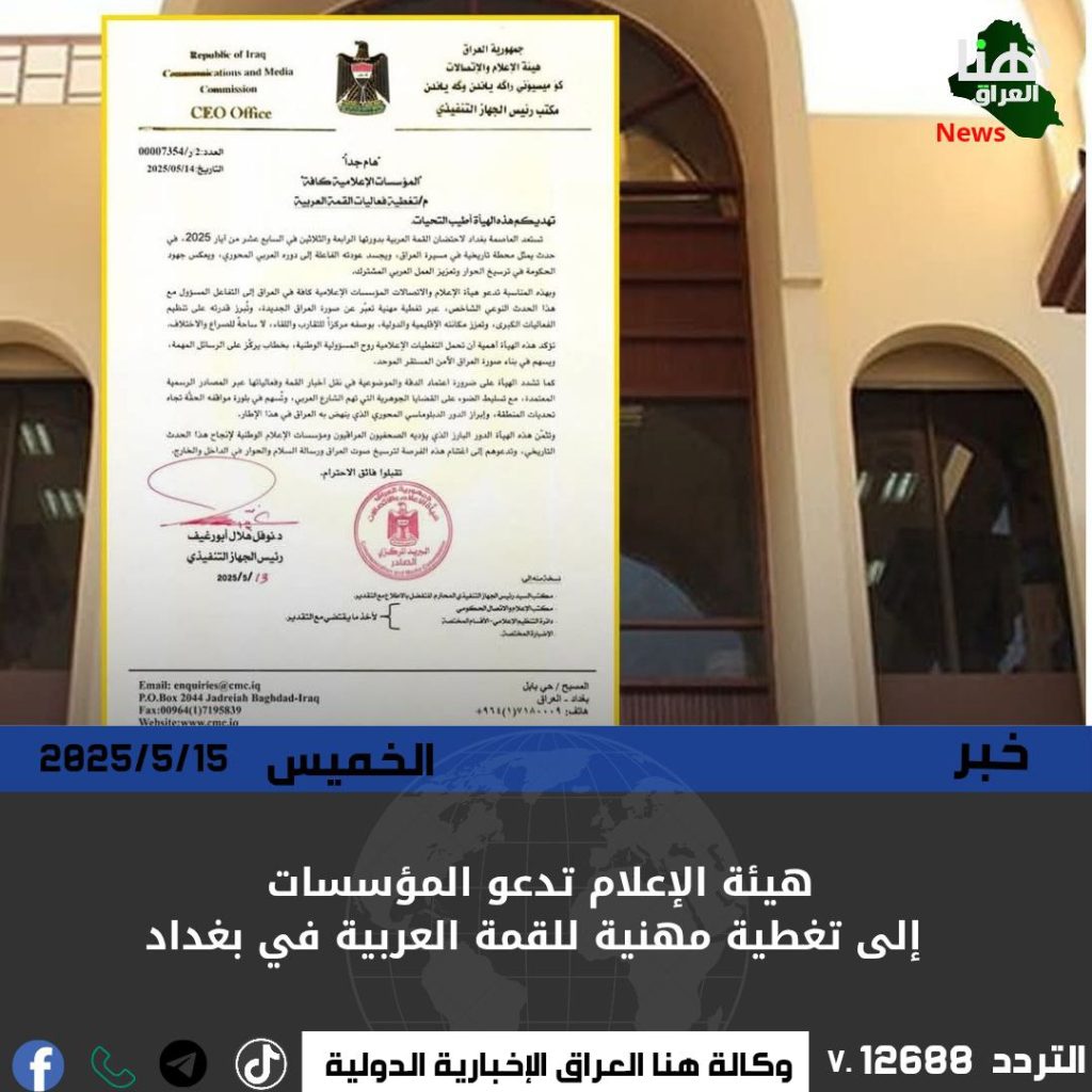 دعت هيئة الإعلام والاتصالات المؤسسات الإعلامية الوطنية إلى التفاعل المهني مع وقائع القمة العربية المرتقبة في بغداد، مؤكدة أن القمة تمثل تحولاً نوعيًا في مسار الدبلوماسية الوطنية، وتعكس صورة العراق المستقر والقادر على تعزيز الحوار والتقارب العربي.