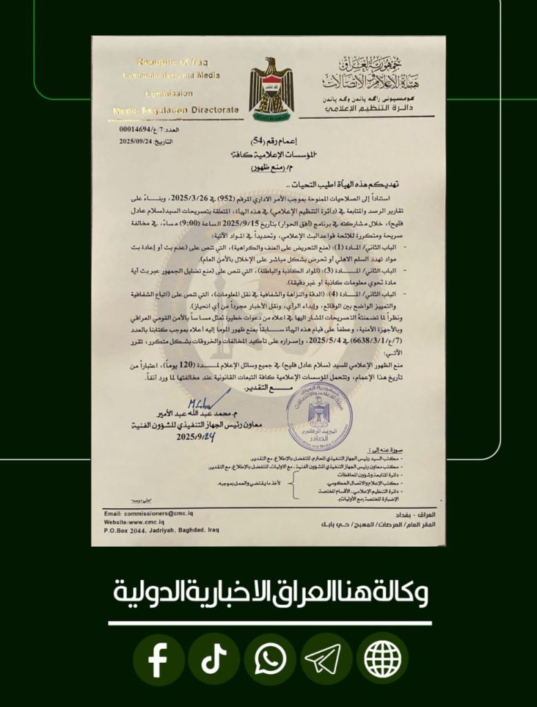 هيئة الاعلام والاتصالات تمنع “سلام عادل” من الظهور الاعلامي لمدة 120 يوماً؛ بسبب كذبه ونشره لمعلومات خاطئة