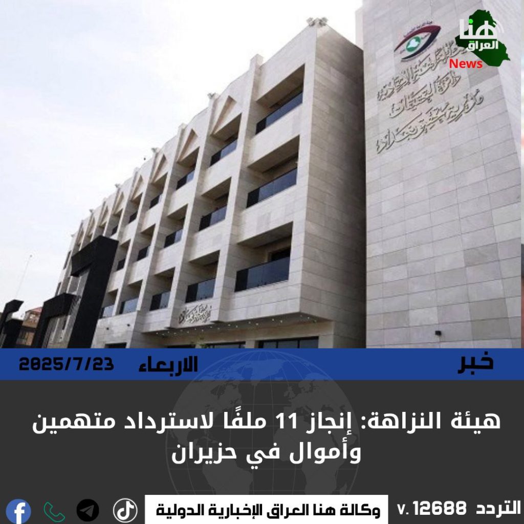 كشفت هيئة النزاهة عن إنجاز 11 ملفًا في إطار جهودها لاسترداد المطلوبين والأموال المنهوبة خلال حزيران الماضي.