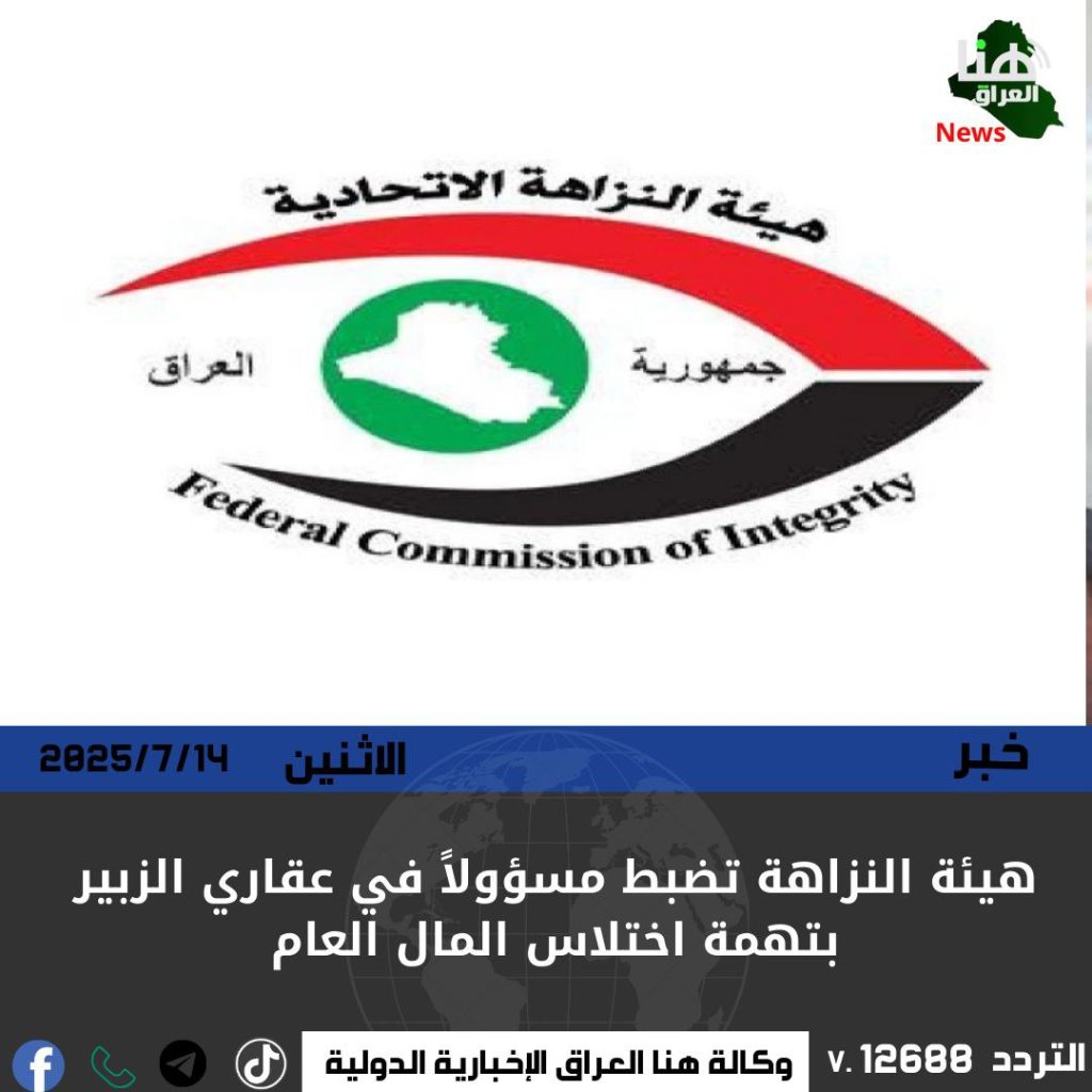 أعلنت هيئة النزاهة عن ضبط مسؤول في دائرة التسجيل العقاري بقضاء الزبير، متهم بالاستيلاء على المال العام.