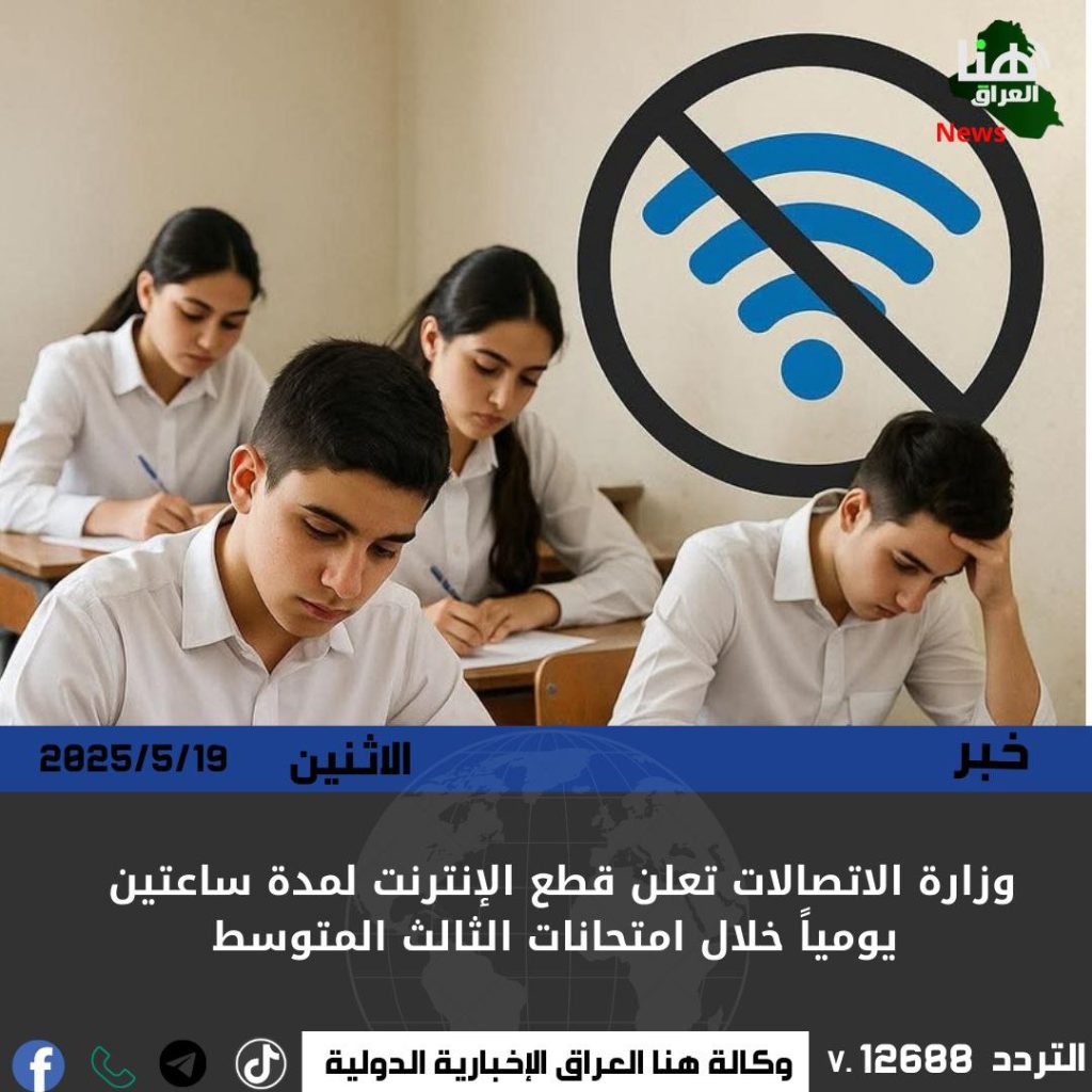 أعلنت وزارة الاتصالات، اليوم الاثنين، عن قطع خدمة الإنترنت يومياً من الساعة 6 صباحاً حتى 8 صباحاً، بالتزامن مع بدء الامتحانات العامة للصف الثالث المتوسط، وذلك بهدف الحفاظ على نزاهة العملية الامتحانية ومنع حالات الغش الإلكتروني.