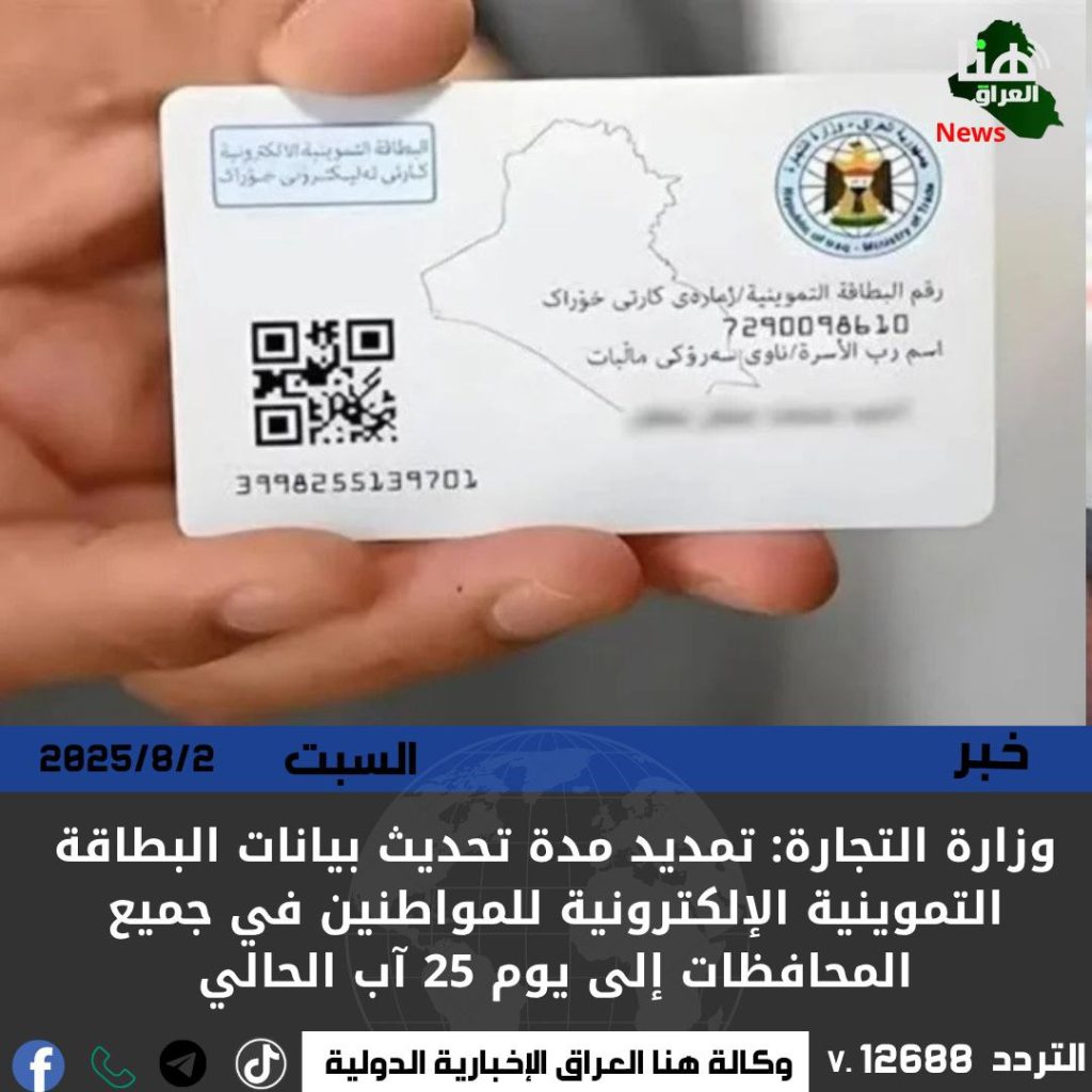الرئيسية/محلي/وزارة التجارة: تمديد مدة تحديث بيانات البطاقة التموينية الإلكترونية للمواطنين في جميع المحافظات إلى يوم 25 آب الحالي محلي وزارة التجارة: تمديد مدة تحديث بيانات البطاقة التموينية الإلكترونية للمواطنين في جميع المحافظات إلى يوم 25 آب الحالي شاركها فيسبوك X لينكدإن Tumblr بينتيريست Reddit VKontakte Odnoklassniki Pocket مشاركة عبر البريد طباعة
