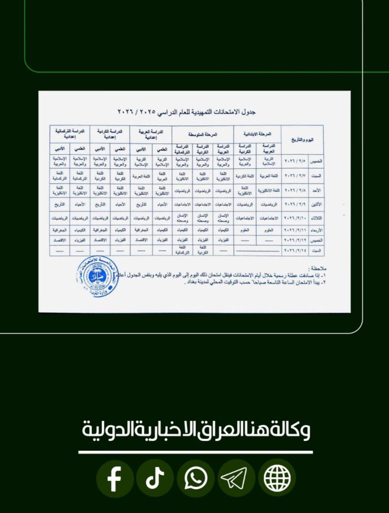 الرئيسية/محلي/وزارة التربية تعلن جدول الامتحانات التمهيدية للعام الدراسي 2025 / 2026 للمراحل الدراسية (الابتدائي والمتوسط والإعدادي) محلي وزارة التربية تعلن جدول الامتحانات التمهيدية للعام الدراسي 2025 / 2026 للمراحل الدراسية (الابتدائي والمتوسط والإعدادي) شاركها فيسبوك X لينكدإن Tumblr بينتيريست Reddit VKontakte Odnoklassniki Pocket مشاركة عبر البريد طباعة