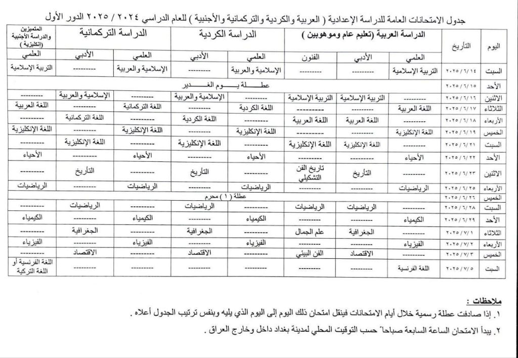 وزارة التربية تنشر الجدول الجديد للامتحانات العامة لطلبة السادس الإعدادي (الدور الاول) / للعام الدراسي (2024-2025) بعد تضمينه عطلة رأس السنة الهجرية