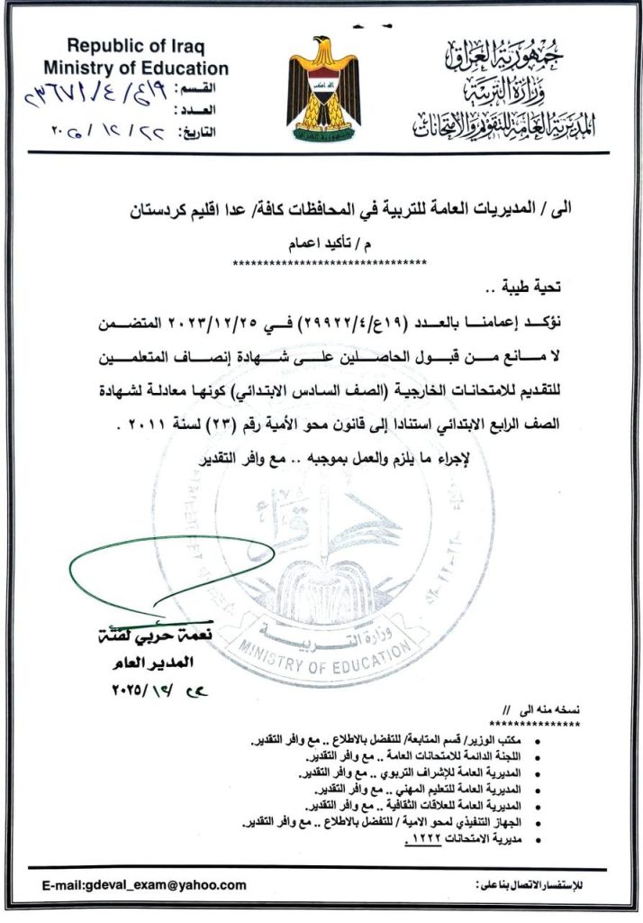 وزارة التربية تُؤكد اعتماد شهادة إنصاف المتعلمين للتقديم للامتحانات الخارجية/ الصف السادس الابتدائي كونها معادلة الشهادة الصف الرابع الابتدائي