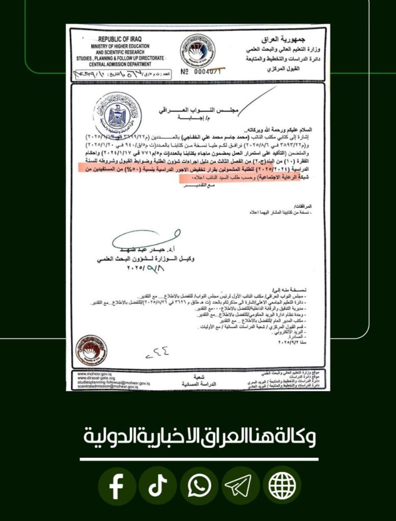 وزارة التعليم تؤكد الالتزام بتخفيض أجور الجامعات للمشمولين بالحماية الاجتماعية بنسبة 50‎%‎