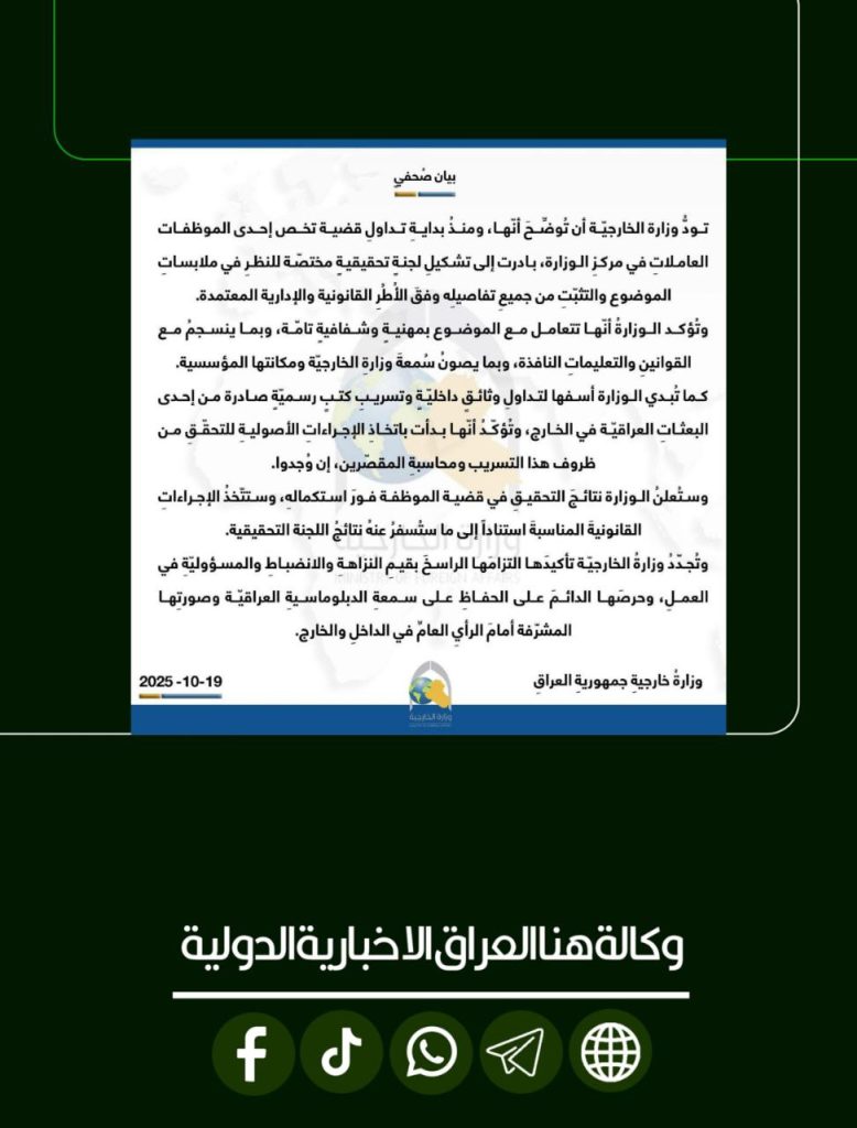 الرئيسية/دولي/وزارة الخارجية تشكل لجنة تحقيقية للتحقق من قضية موظفة وتسريبات وثائق رسمية وتتعهّد باتخاذ الاجراءات القانونية. دوليسياسةمحلي وزارة الخارجية تشكل لجنة تحقيقية للتحقق من قضية موظفة وتسريبات وثائق رسمية وتتعهّد باتخاذ الاجراءات القانونية. شاركها فيسبوك X لينكدإن Tumblr بينتيريست Reddit VKontakte Odnoklassniki Pocket مشاركة عبر البريد طباعة