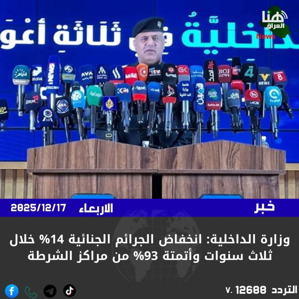 أعلنت وزارة الداخلية، اليوم الأربعاء، تسجيل انخفاض في نسبة الجرائم الجنائية بلغ 14 بالمئة خلال السنوات الثلاث الماضية، في مؤشر على تحسن الواقع الأمني وتعزيز الاستقرار الداخلي.