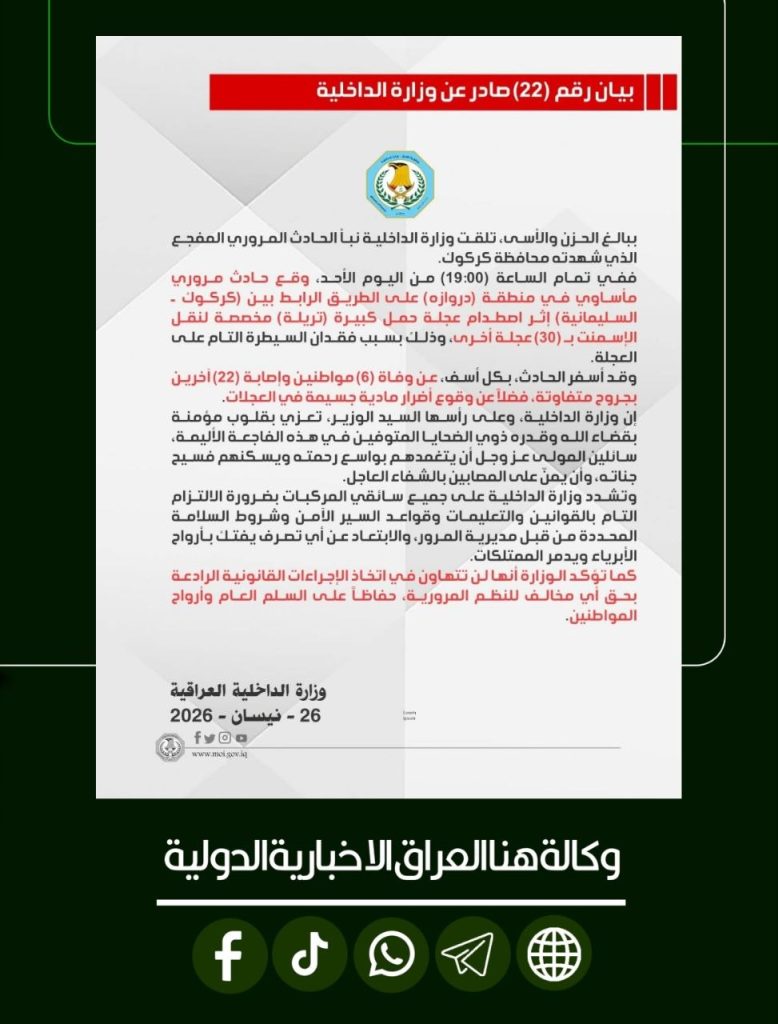 وزارة الداخلية تعزي بضحايا حادث كركوك وتؤكد لن نتهاون في اتخاذ الإجراءات القانونية الرادعة بحق أي مخالف للنظم المرورية