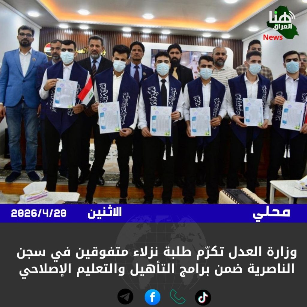 أعلنت وزارة العدل العراقية عن تكريم 6 طلبة من النزلاء في سجن الناصرية المركزي، بعد حصولهم على الإعفاء العام في الدراسة المتوسطة، ضمن برامج التعليم داخل المؤسسات الإصلاحية.