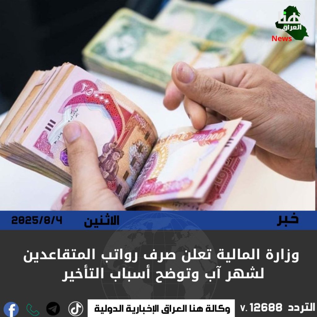 أعلنت وزارة المالية إطلاق تمويل رواتب المتقاعدين المدنيين والعسكريين لشهر آب، مشيرةً إلى أن عمليات التحويل قد استُكملت لدى هيأة التقاعد الوطنية.