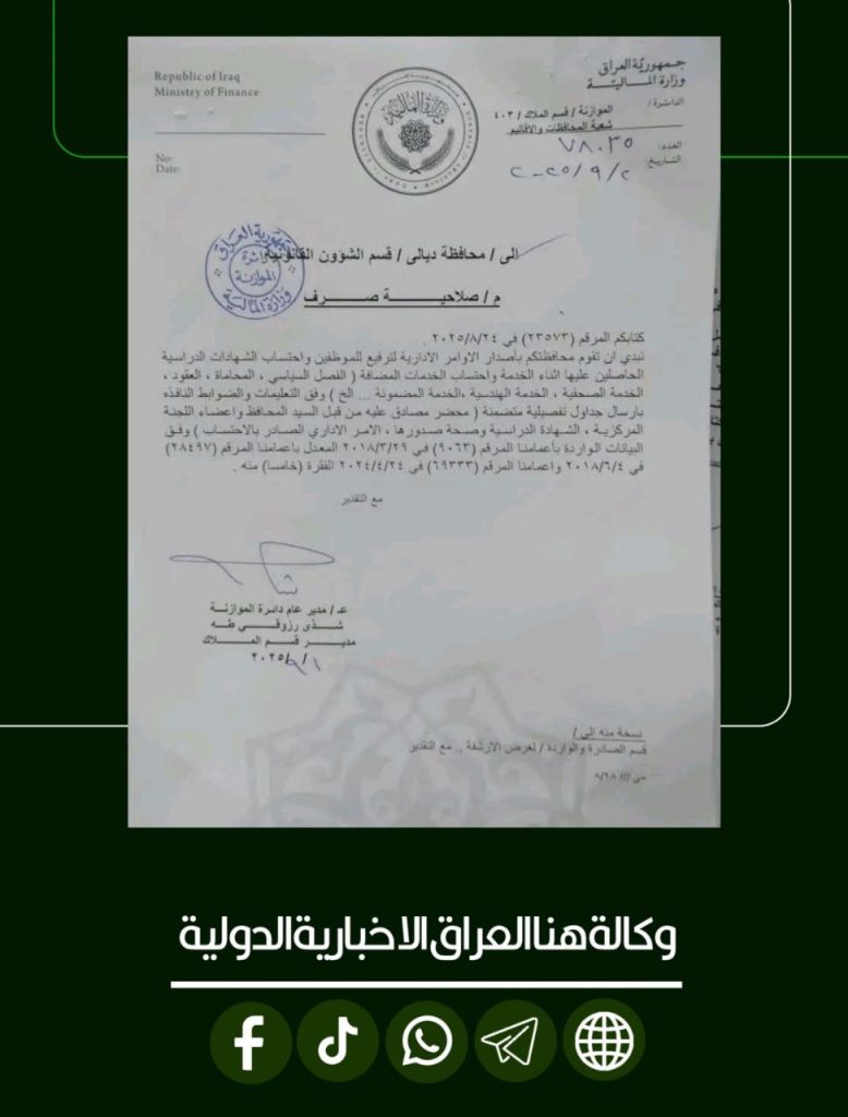 وزارة المالية تمنح ديالى صلاحية صرف مستحقات الترفيعات واحتساب الشهادات والخدمات