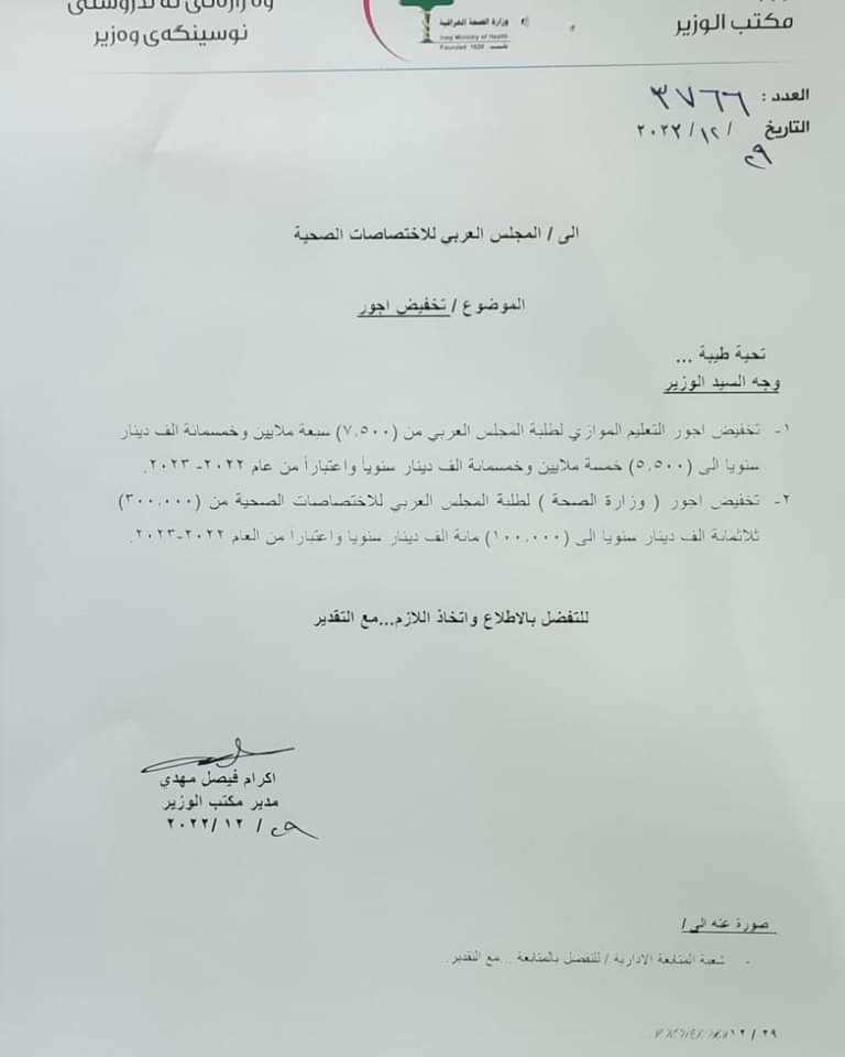 وبحسب وثيقة صادرة من مدير مكتب وزير الصحة فأن الاخير “وجه بتخفيض أجور التعليم الموازي لطلبة المجلس العربي من (7500000) دينار الى (5500000) دينار سنوياً اعتباراً من العام 2022 – 2023
