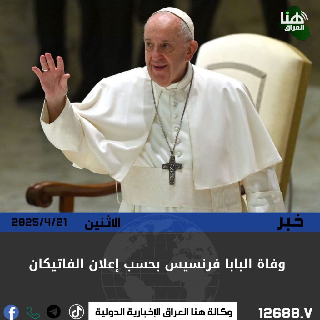 أعلن الفاتيكان، قبل قليل، وفاة البابا فرنسيس، بابا الكنيسة الكاثوليكية.