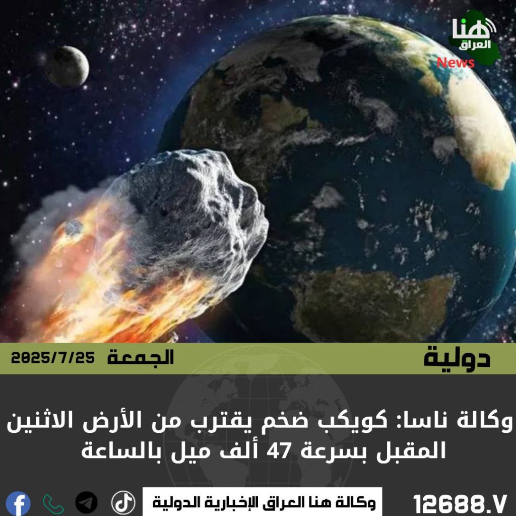 الرئيسية/دولي/وكالة ناسا: كويكب ضخم يقترب من الأرض الاثنين المقبل بسرعة 47 ألف ميل بالساعة دولي وكالة ناسا: كويكب ضخم يقترب من الأرض الاثنين المقبل بسرعة 47 ألف ميل بالساعة شاركها فيسبوك X لينكدإن Tumblr بينتيريست Reddit VKontakte Odnoklassniki Pocket مشاركة عبر البريد طباعة