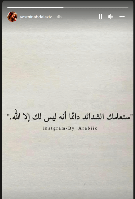 من جانبها، نشرت ياسمين عبد العزيز صورة جديدة عبر “قصص انستغرام“، وكتبت: “ستعلمك الشدائد دائما أنه ليس لك إلا الله”.