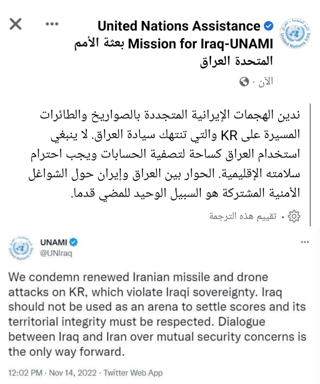 وقالت البعثة في تدوينة على موقع تويتر تابعتها قناة هنا العراق الاخبارية “ندين تجدّد الهجمات الإيرانية بالصواريخ والطائرات المسيرة على إقليم كردستان، والتي تنتهك السيادة العراقية”.