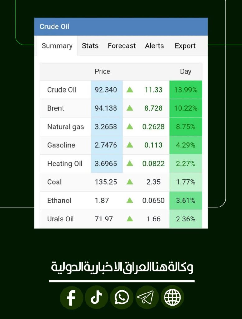 الرئيسية/اقتصاد/🔴سعر برينت يتجاوز حاجز 94 دولار بسبب الحرب على ايران اقتصاد 🔴سعر برينت يتجاوز حاجز 94 دولار بسبب الحرب على ايران شاركها فيسبوك X لينكدإن Tumblr بينتيريست Reddit VKontakte Odnoklassniki Pocket مشاركة عبر البريد طباعة