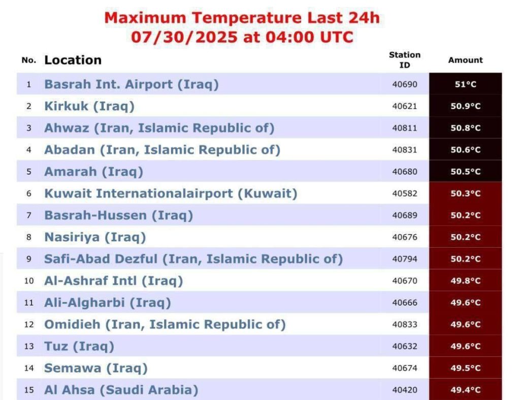 الرئيسية/الطقس/9 مدن عراقية بين الأعلى حرارةً عالمياً هذا الأسبوع الطقسمحلي 9 مدن عراقية بين الأعلى حرارةً عالمياً هذا الأسبوع شاركها فيسبوك X لينكدإن Tumblr بينتيريست Reddit VKontakte Odnoklassniki Pocket مشاركة عبر البريد طباعة