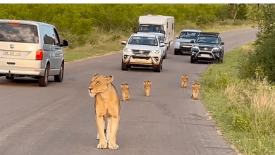 أنثى أسد وأشبالها يتسببون بزحام مروري
